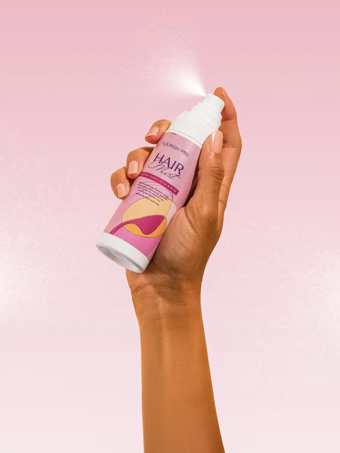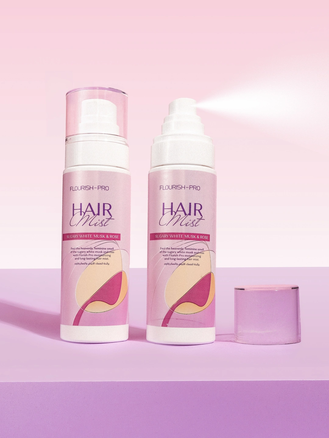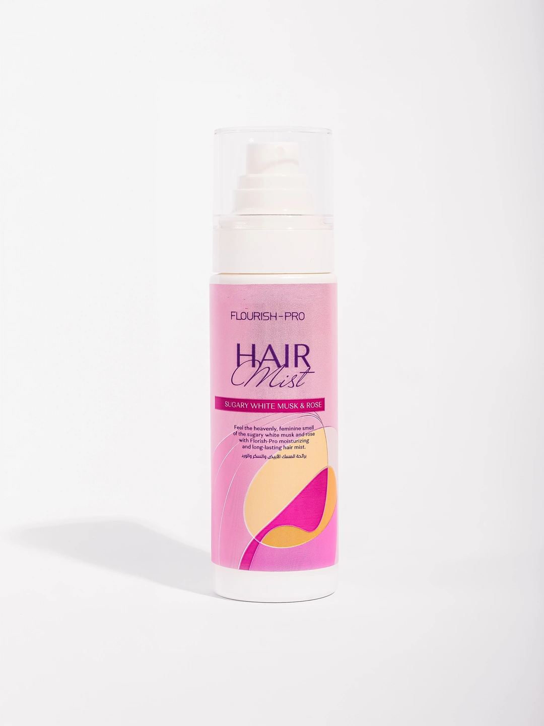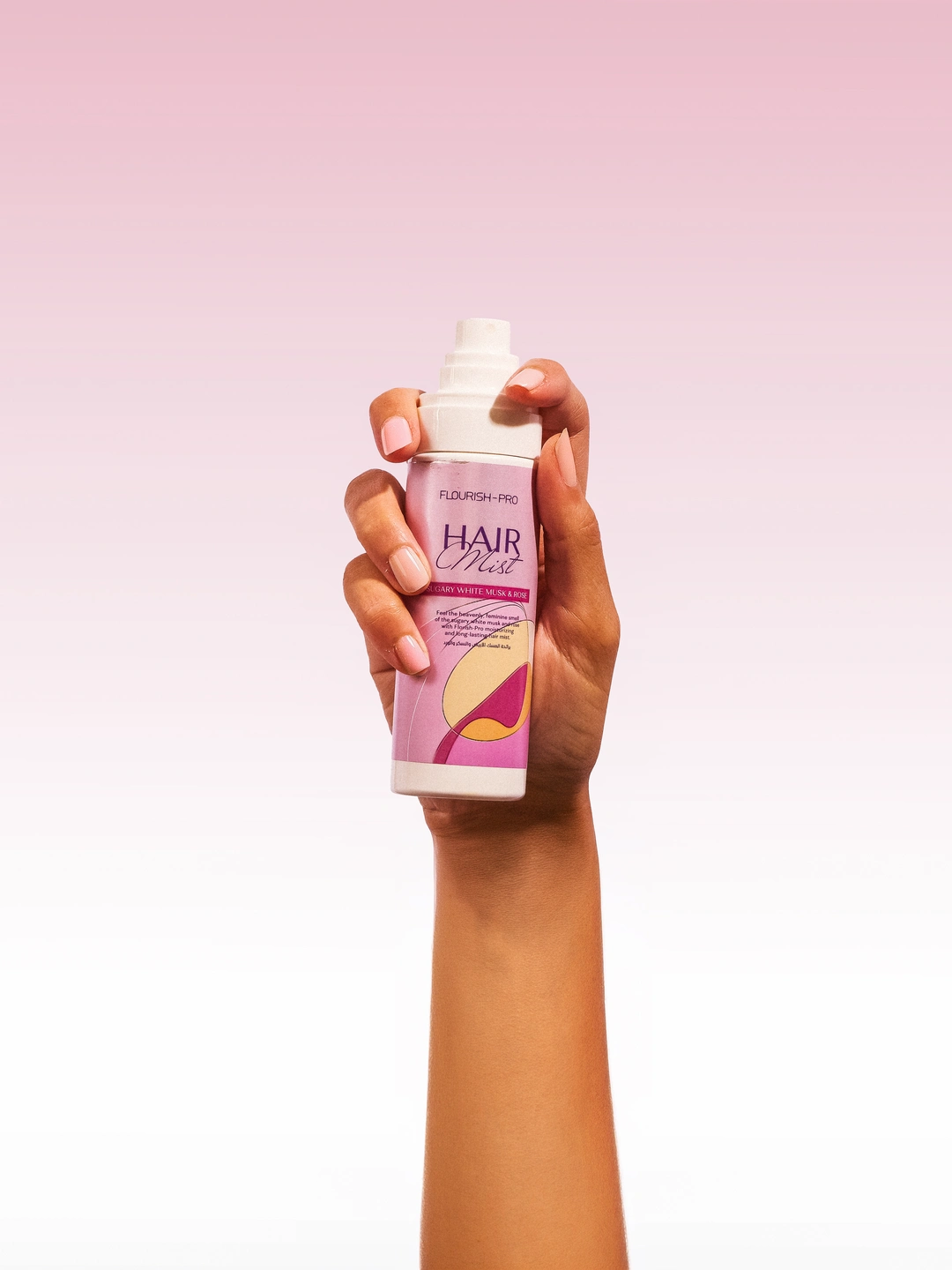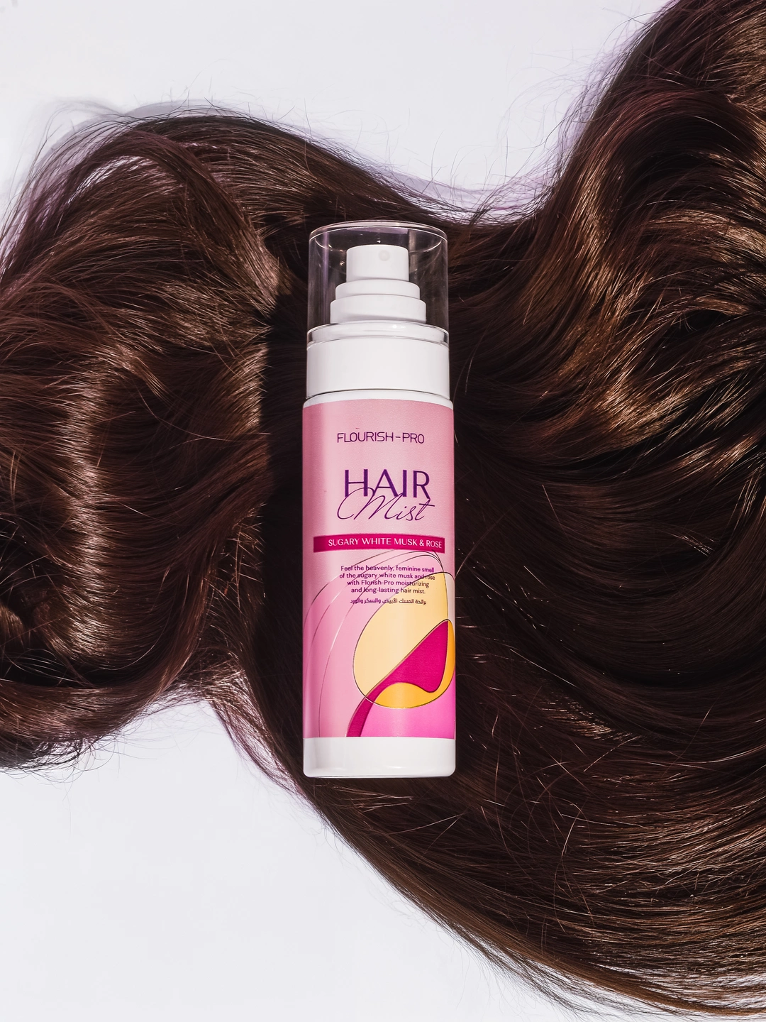Flourish Hair Mist is a lightweight, refreshing fragrance mist designed to envelop your hair in a delicate blend of Sugary, white musk and soft rose notes, leaving it smelling fresh, feminine, and elegant.
